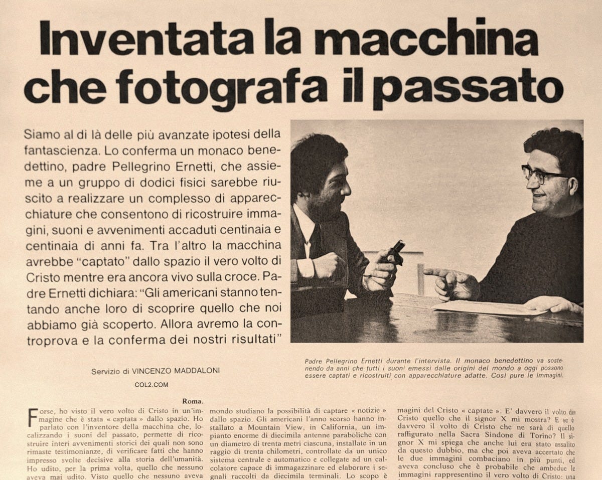 The Chronovisor was a device reputedly invented in the 1960s by Benedictine monk Pellegrino Ernetti. It claimed to be capable of viewing past events by detecting residual electromagnetic radiation, tuning into history as if it were a perpetual broadcast waiting to be seen. Accounts of it describe antennas and a “direction finder” used to lock onto past “frequencies,” producing image and sound on a screen, like a time-travelling television set. The reported subjects the Chronovisor could see included monumental religious and cultural events such as the crucifixion of Jesus Christ and rituals in ancient Rome.